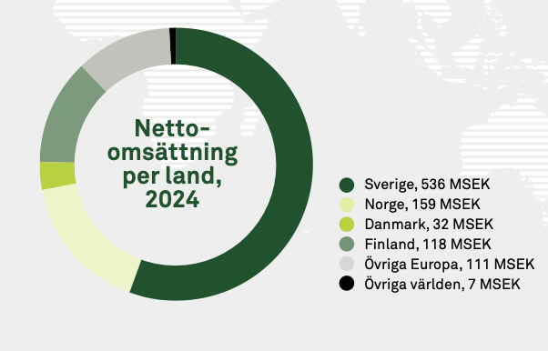 Halva omsättningen i Sverige, sedan stor del i Norge och Finland. Se tabell nedan för att förstå geografiska försäljningen per land.