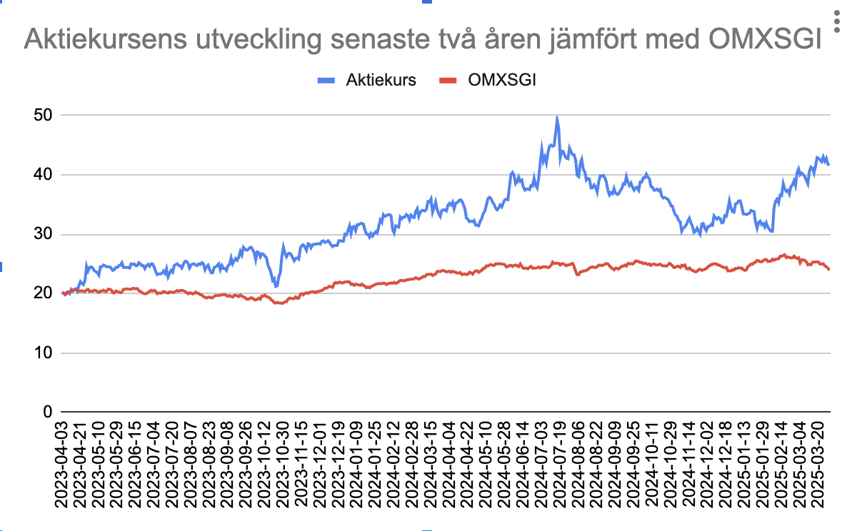 Bolaget har under senaste åren inte rört sig så mycket, främst för att det inte har hänt så mycket i bolaget som har varit direkt påverkade på siffrorna för aktieägarna, därmed har det inte varit några förväntningar på bolaget som har långsamt krattat i ordning på torpet för att nu gå in i en ny fas med ordning och read tillsammans med en lägre skuldsättning än tidigare. Bolaget har under 2025 rört sig från runt 35 sek aktien till dagens kurs på ca 48 sek. Viss överprestation mot index de senaste två åren, men ganska marginellt givet det är högre risk också.
