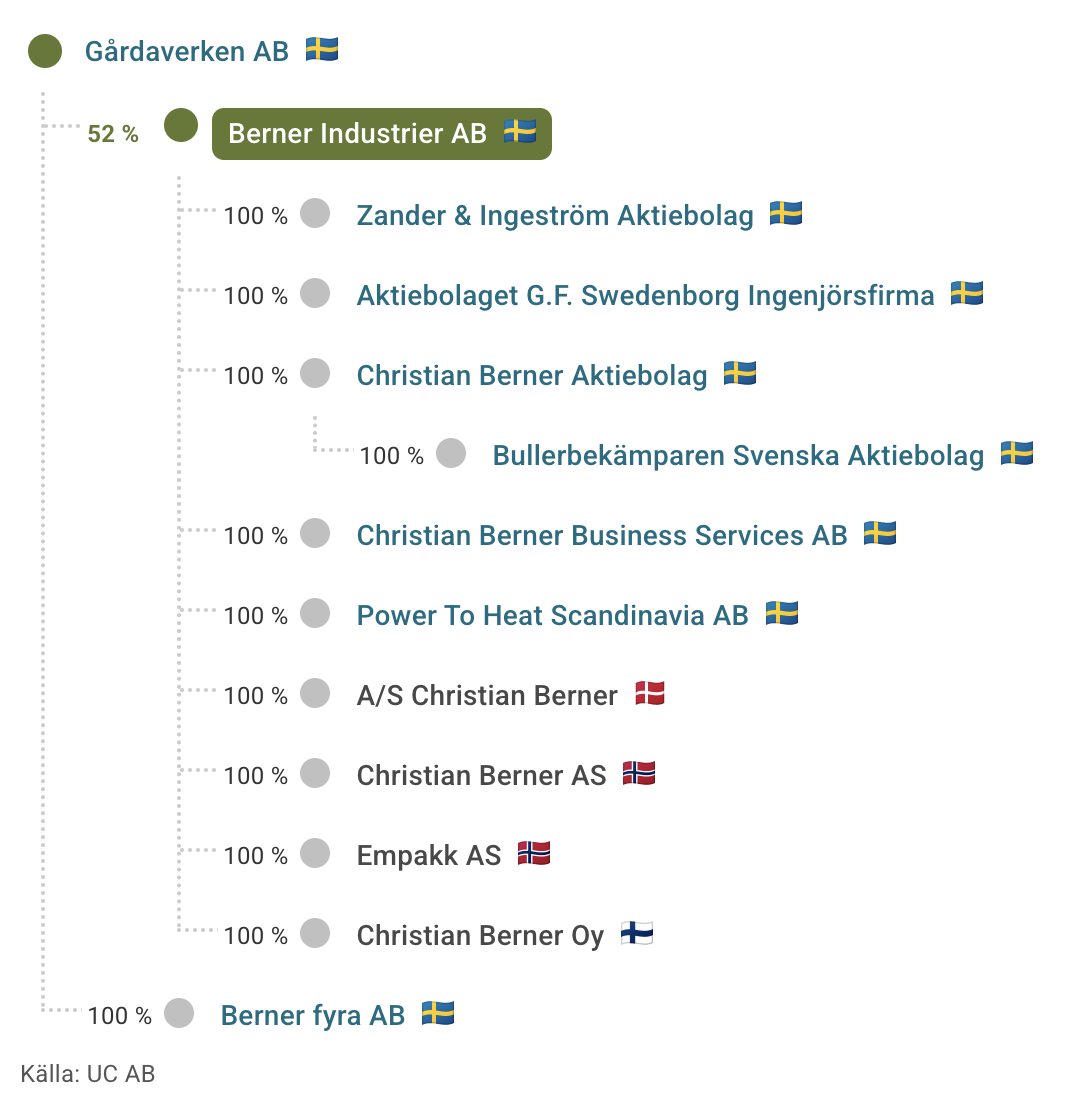 Gårdaverken är familjen Berners ägarbolag. Power to heat är en del av Zander & Ingeström efter en sammanslagning. Med ett par justeringar går det att se att underliggande bolag ser ut ungefär som följande enligt senaste tillgänglig data: