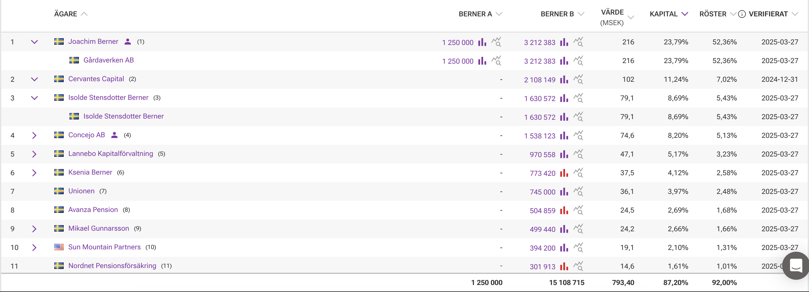 Aktieinnehav i Berner Industrier AB: 1 250 000 A-aktier och 3 212 383 B-aktier genom Gårdaverken AB.