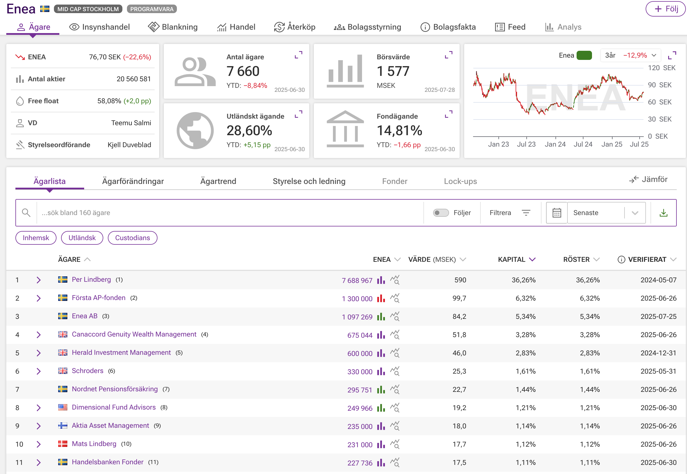 Aktien är noterad på mid cap. Enea genomför ett återköpsprogram och köper tillbaka ca 1,2 miljoner aktier om året, totalt är mandatet på 100 miljoner SEK under ett år. Det går att se att antalet aktier drar ihop sig snabbt.