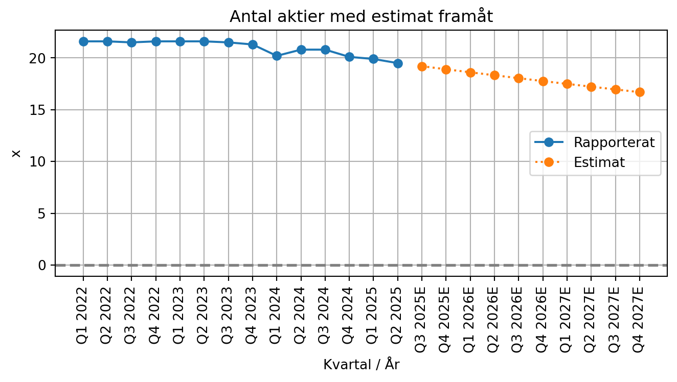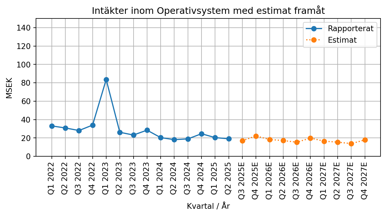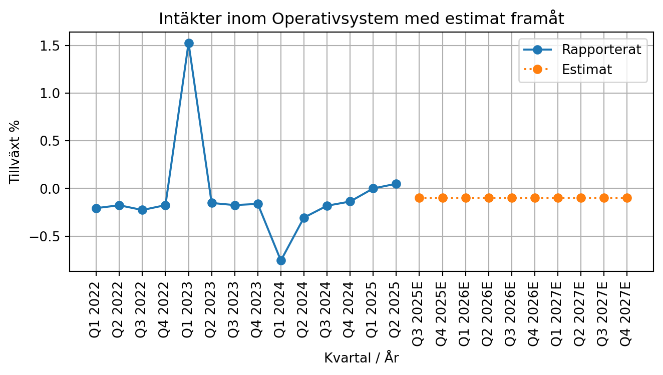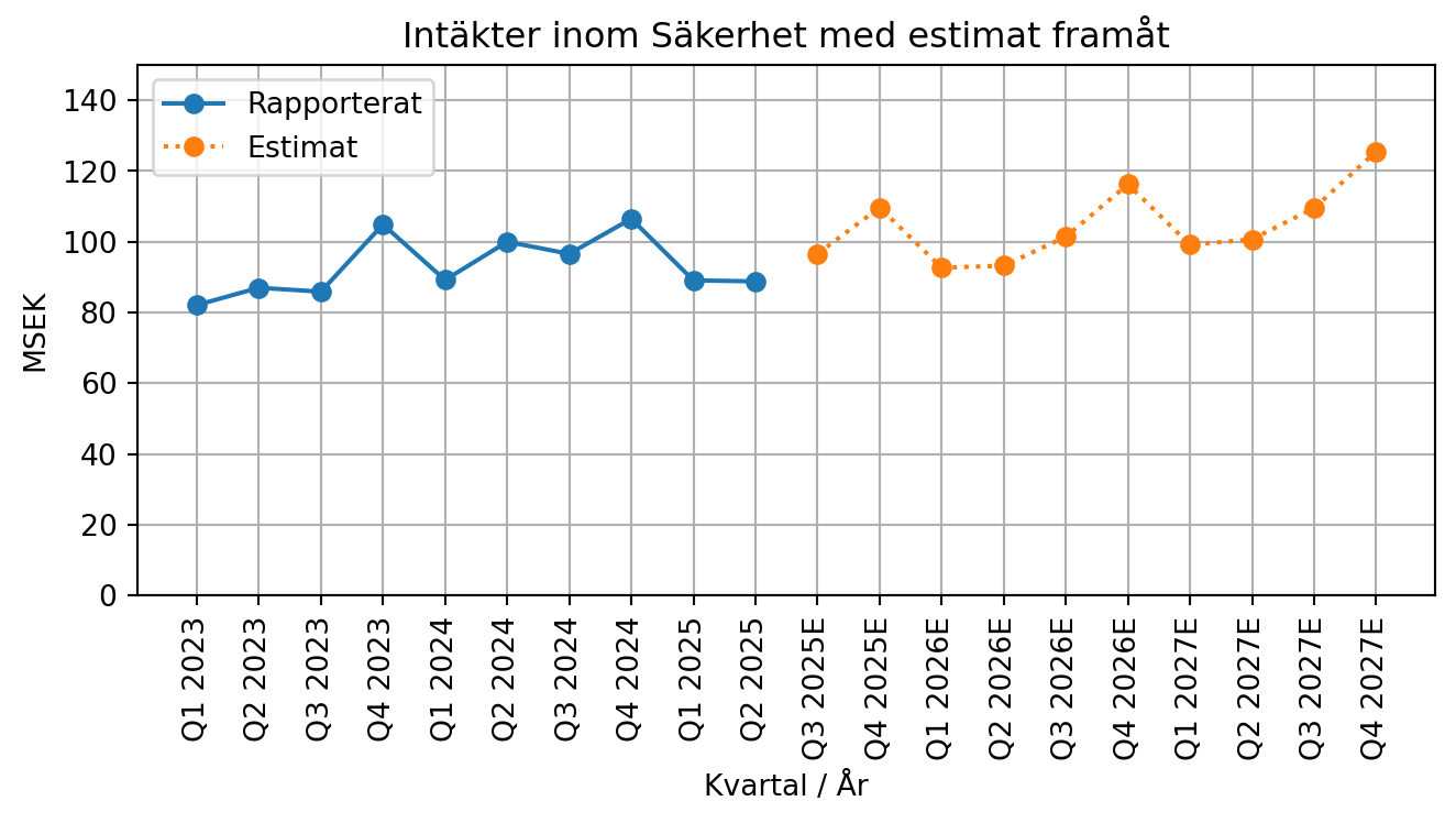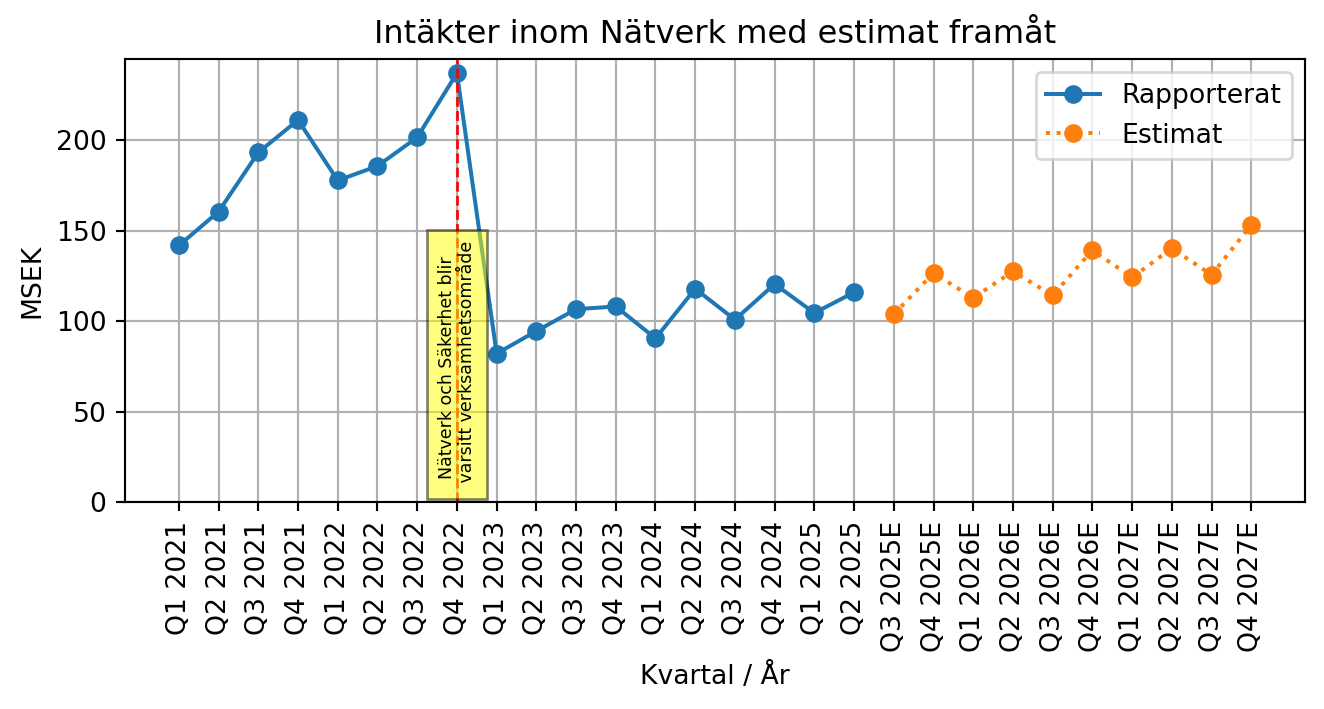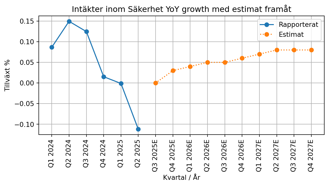 Säkerhet har växt med 2.8 procent per år sedan Q1 2023 fram till Q2 2025. Säkerhet som segment har inte gått lika bra som nätverk och framåt är det svårt att göra en prognos. Trots det väljer jag att skissa in en konvergering mot målet på 10 procent och landar runt 8 procent omsättningstillväxt efter Q3 2026.