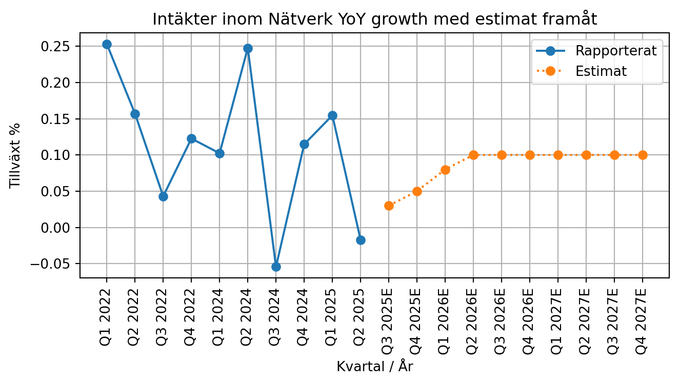 I Q4 2022 delades Nätverk och säkerhet till varsitt område. Sedan Q1 2023 till Q2 2025 så har nätverk växt med 6.2% i snitt per år. Framåt skissar jag på att Nätverk konvergerar mot sitt långsiktiga mål på 10 procent per år.