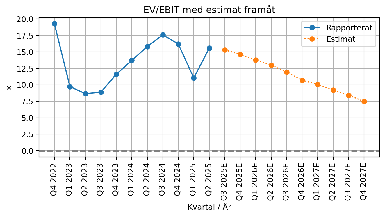 Om prognosen faller att vi får en ebit marginal framåt på runt 15 procent samt en gradvis tilltagande tillväxt under 2026 och 2027 så ser vi att EV/EBIT blir 7.1x till slutet av 2027E.