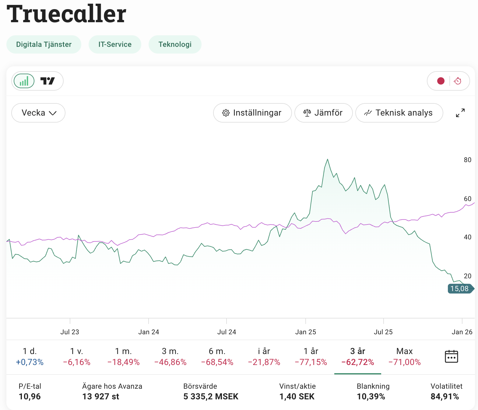 Risk: Det kan ta tid innan marknaden omvärderar aktien. Fallande vinster brukar sällan värderas upp även om de ser billiga ut. I skrivande stund möter Truecaller stark fundamental och teknisk motvind, vilket kan pressa kursen ytterligare innan botten är nådd.