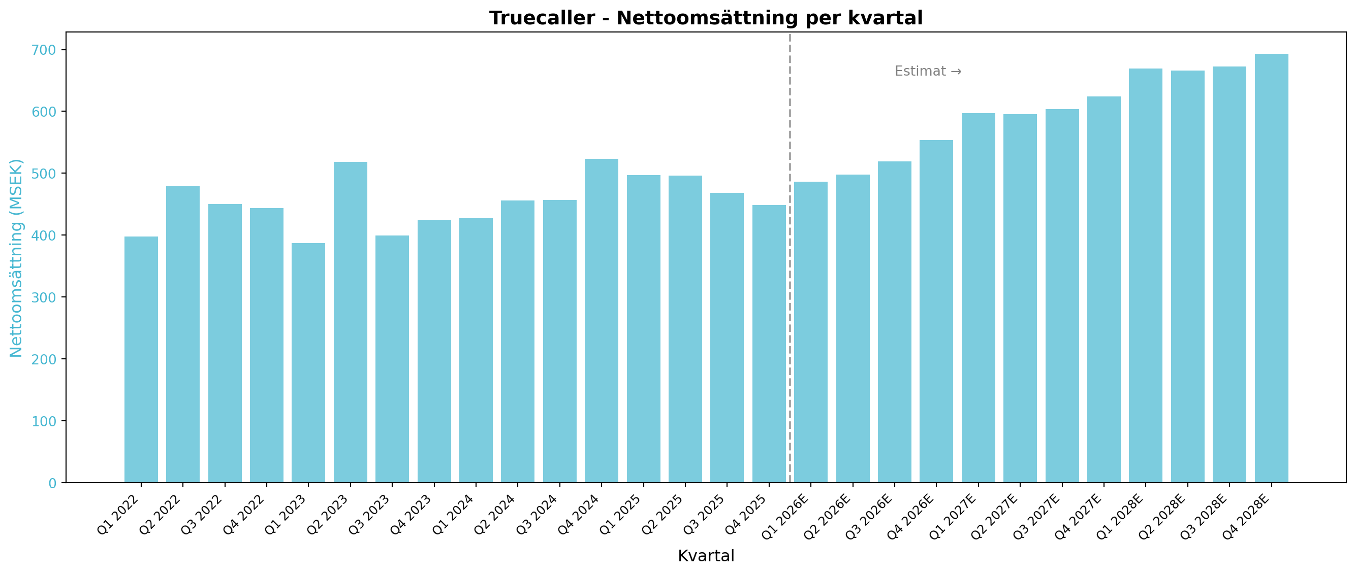 ax1.set_title('Truecaller - Nettoomsättning per kvartal', fontsize=14, fontweight='bold')