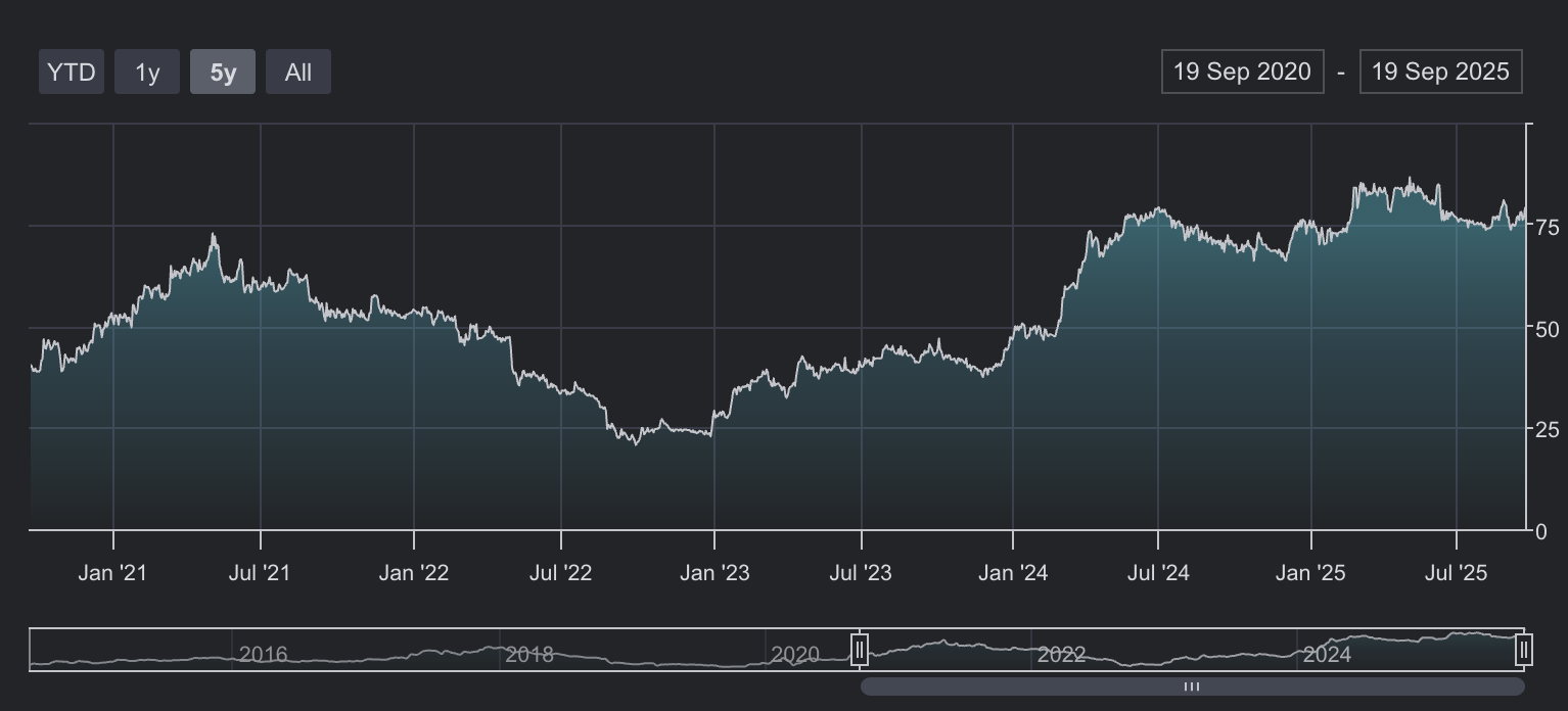Zalaris har haft en stabil kurs på runt 75 nok senaste året. Noterad i Norge.