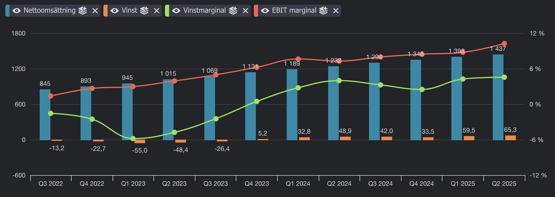 Omsättning 2 miljarder NOK till helåret 2028 med en EBIT på 13-15 procent. Detta nya mål sattes i Q1 2025.