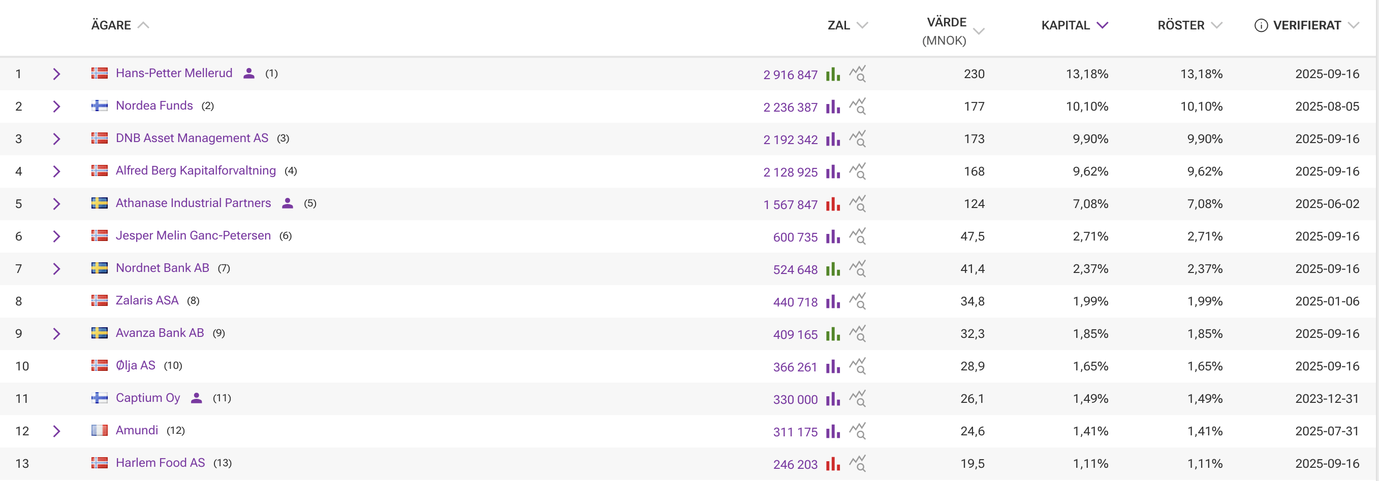 Vd är största ägare, sedan är Nordea, Alfred Berg och DNB med i listan med runt 10 procent vardera. De får inte äga mer än 10 procent så därför är de precis på gränsen. Det är många institionella förvaltare som är inne.