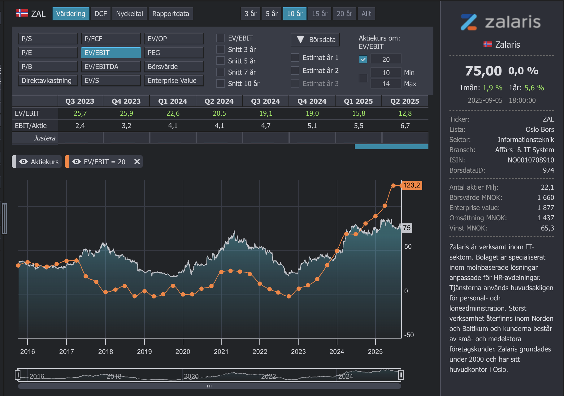 Värderingen för Zalaris bör vara runt 15x ev/ebit givet att bolaget växer med 10 procent framåt och levererar en lite högre rörelsemarginal på 13 procent istället för dagens 10 procent.