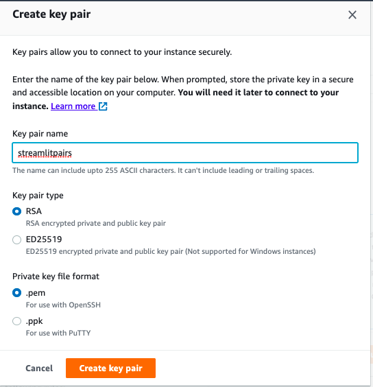 2. Locate your private key file. The key used to launch this instance is streamlitpair.pem