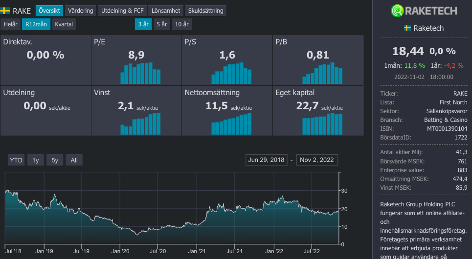 Raketech är verksamma inom affiliate marketing branschen med fokus på casino och sportsbetting kunder. Jag gillar bolaget för att bolaget är ganska litet med ca 700 mkr i market cap och att bolaget leds av en trovärdig vd. Oscar Mühlbach (vd) har under sin tid vid rodret gjort precis det som han pratat om att göra, det gör han även trovärdig att fortsätta leverera på sina åtagande.