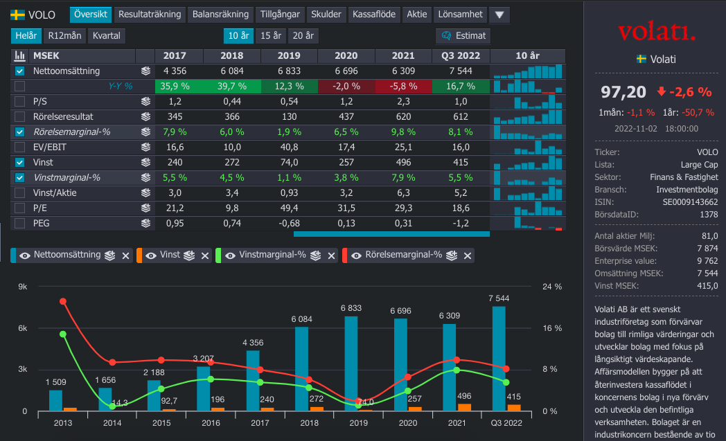 Volati är en industrigrupp som påminner lite om Teqnion fast det är mycket större. Volati har haft starka ägare under en lång tid, med en skarp och färgstark styrelseordförande vid namn Patrik Wahlén. Volati har exponering mot många olika typer av industri vilket alla ser ut att vara vettiga verksamheter.
