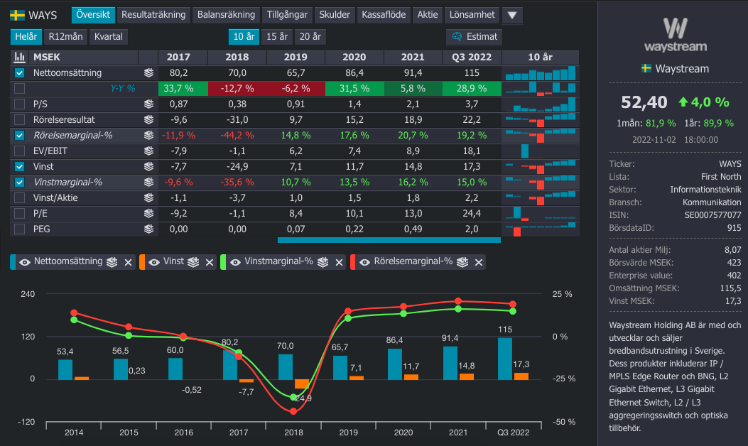 Jag gillar waystream, speciellt med Fredrik som har klivit in som vd nu och har en bättre säljprofil. Q3 2022 var helt ofantligt stark och det var helt klart ett trendbrott i hur bolaget har gått jämfört med tidigare. Värderingen har dragit iväg från ca P/E 10 till runt 22 nu.