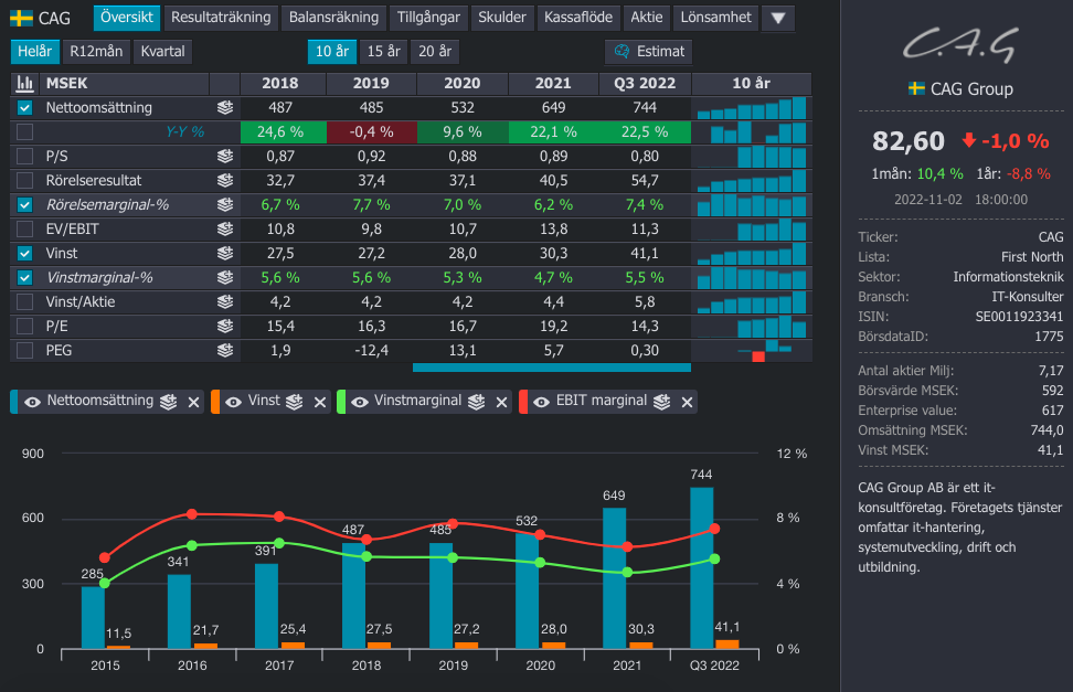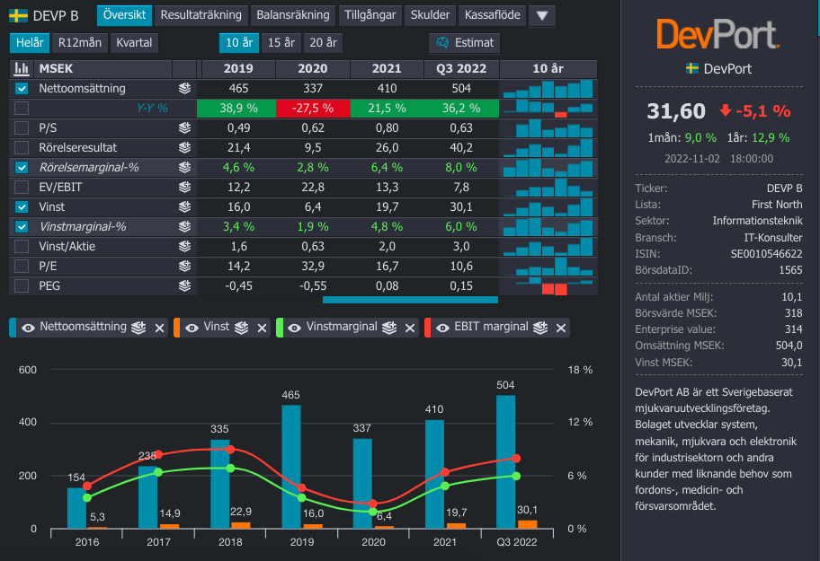 Devport är ett konsultbolag som riktar sig främst mot fordonsindustrin. Verksamma inom produktion och digitalisering, vilket generellt har varit en bra bransch. Devport har under lång tid växt på väldigt bra med 21 procent CAGR mellan 2016 till 2021. Fordonsindustrin är däremot känd för att vara lurig och att snabbt kasta ut sina konsulter när marknaden viker. Med det i åtanke låter det som att bolaget ska värderas till runt P/E 15, vilket det har gjort historiskt. Baserat på Q3 2022 så värderas Devport till P/E 11.
