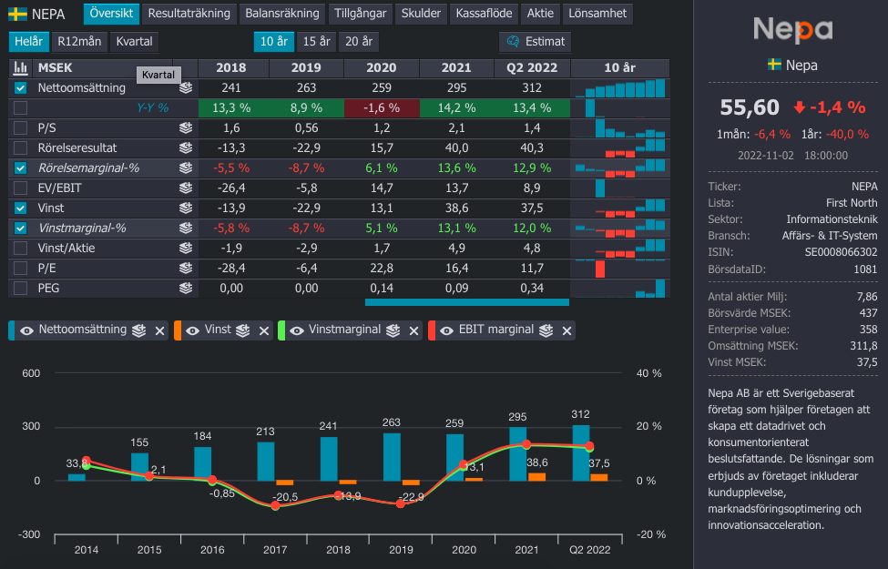 Nepa är ett marknadsundersöknings bolag som under en lång tid var en undervattensdrake som nyligen passerat vattenytan och börjar tjäna pengar. Bolaget har under en längre tid sysslat med konsulttjänster, men under senare tid klassas allt mer av intäkterna som återkommande vilket bör skapa stabilitet.